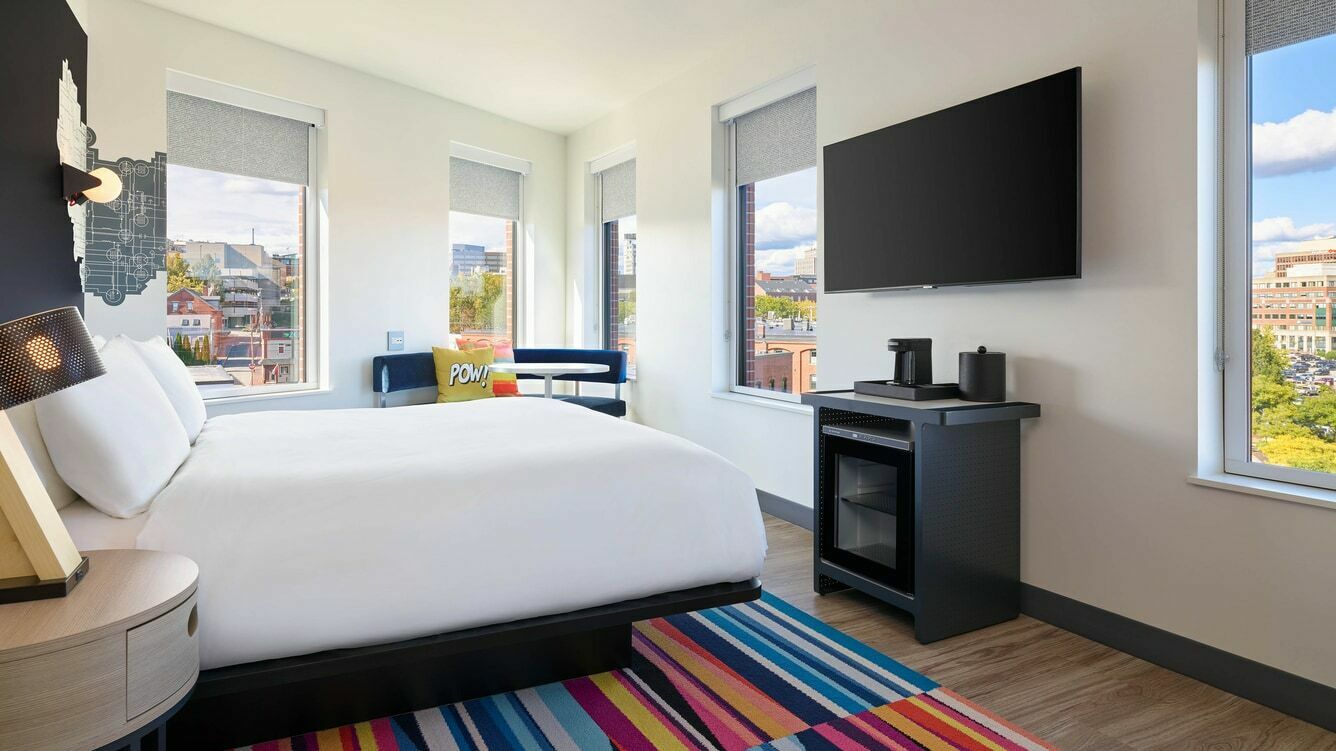 Different by design, our downtown Portland, ME hotel sits amid the urban sophistication of a working waterfront, walking distance to attractions, eateries, art galleries, and nightlife. Open in space and spirit, the Aloft Portland uses technology and design to enhance experiences and move at your pace. Airy rooms at our pet-friendly hotel in Portland, ME feature fast & free WiFi, plush platform beds, LCD TVs, custom Aloft bath amenities by Bliss® Spa, and walk-in showers with rainfall showerheads, with a special welcome for our younger guests (Camp Aloft) and four-legged friends (Arf: Animals are Fun). Our hotel near Portland, ME is where travel breaks the mold: Stay fit at Re:charge, offering cardio and free weights, or take a plunge in our stylish pool. Meet at The Tactic, for up to 15 attendees. Grab breakfast at Re:fuel or dinner and drinks at WXYZ, our casual lobby bar and one of our favorite places to eat in Portland, ME. Stay where travel breaks the mold, at our Portland waterfront hotel.