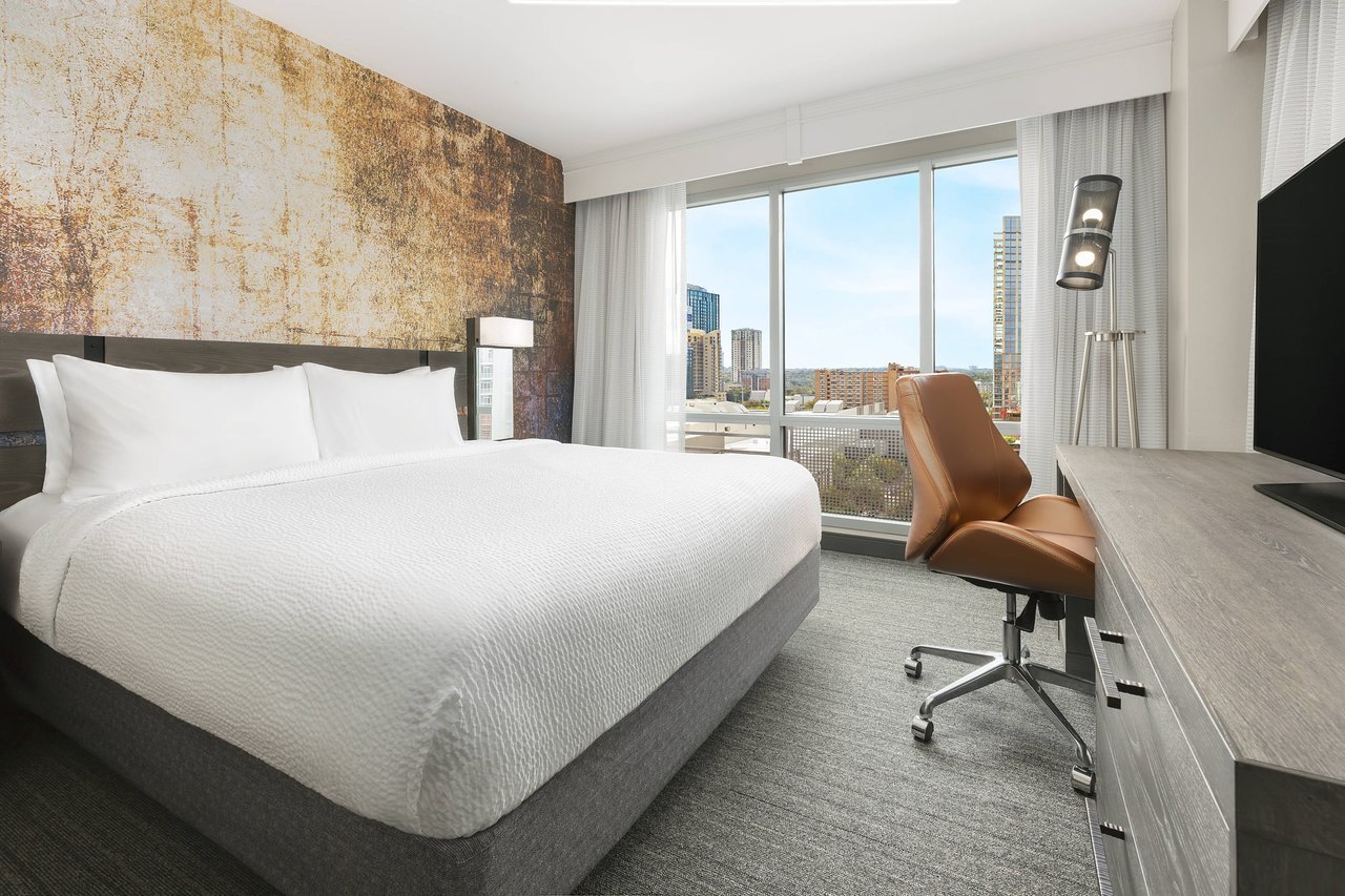 Across the street from Austin Convention Center, and just a short distance from 6th Street, University of Texas and the State Capitol, you'll enjoy fast, free Wi-Fi at our downtown hotel. Fuel up for a day of fun with breakfast from our on-site Starbucks®, then return in the evening for dinner, cocktails, or the big game at Champions Restaurant and Bar. During free time, utilize our fitness center for a full-body workout before enjoying a few laps in our indoor pool. Take in the natural beauty of downtown Austin with a hike around Zilker Park, or opt for an afternoon of paddle boarding. When it's time to call it a night, retire to our spacious hotel rooms and suites, each offering plush bedding and an ergonomic workspace to make you feel at home.