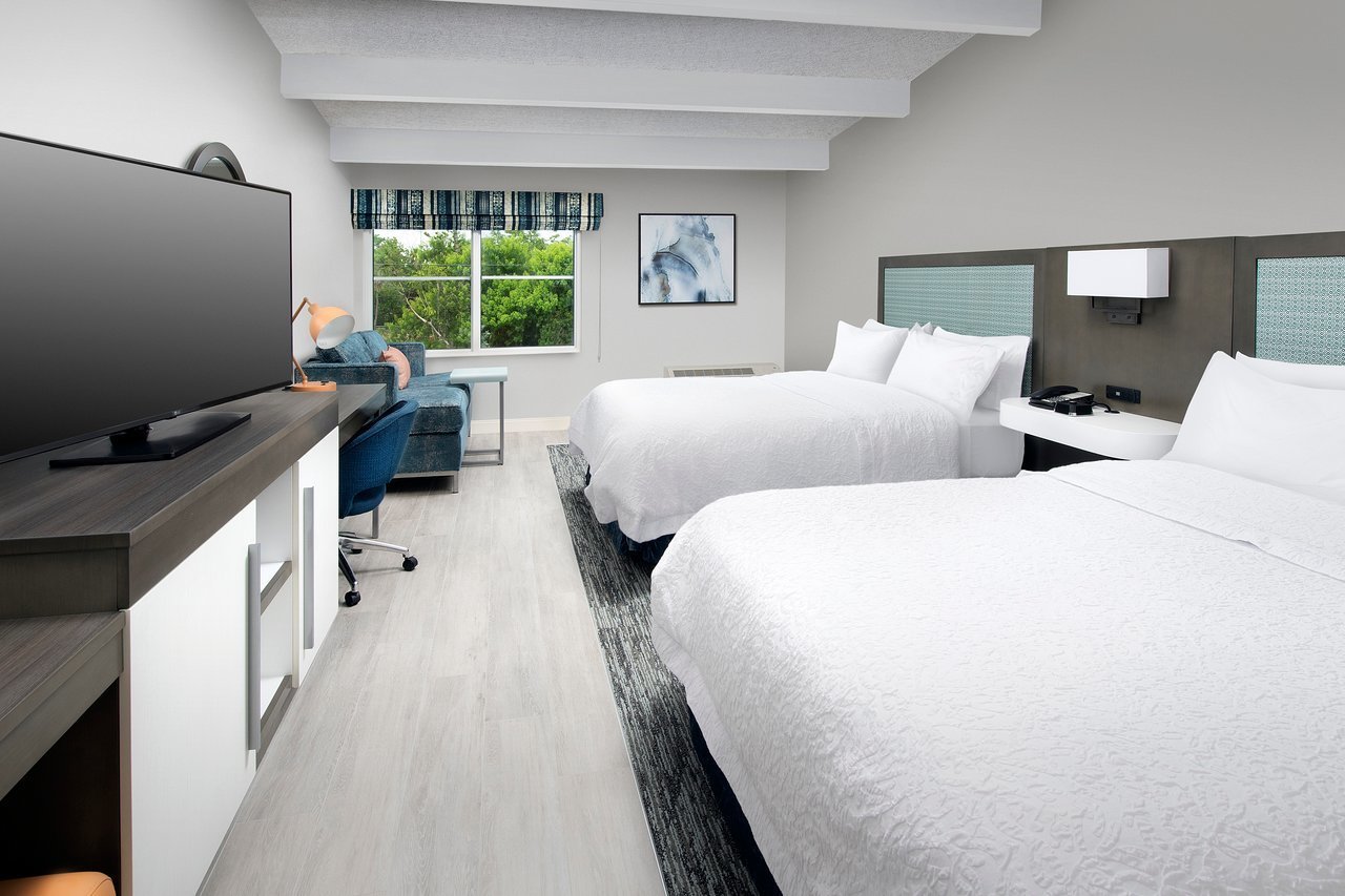 Our modern guest rooms feature free WiFi, a microwave, refrigerator, work desk, in-room safe and 49-inch HDTV. Some of our rooms will have balconies with sliding glass doors. Head to the lobby for a complimentary hot breakfast each morning, or grab one of Hampton’s On the Run™ Breakfast Bags, available Monday through Friday. If you have to get work done, stop by the business center with access to a computer, faxing and printing capabilities. We feature a boardroom for small meetings and a onsite fitness center. Walk to boat rentals, swim at Sombrero Beach and relax watching the sunsets at Calusa Beach.