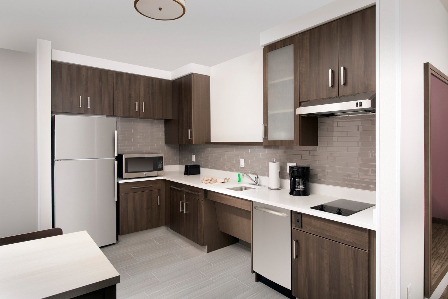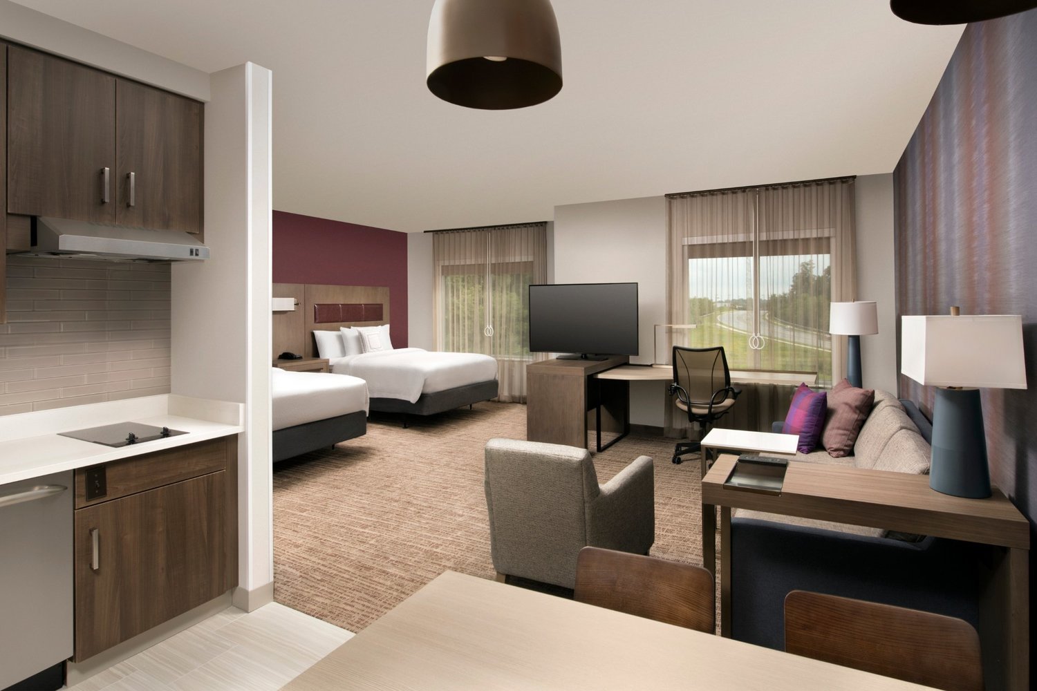 The Residence Inn Baltimore Owings Mills is an all-suite, pet-friendly hotel located northwest of Baltimore. We have everything you need to balance work and life during your short or long extended stay. Wake up every day to complimentary breakfast, serving both hot and cold items – eggs, bacon, sausage, assorted fruits, cereals and more. Join our Residence Inn Mix where we offer light fare with free beer/wine Mon- Wed evenings. Our grocery delivery and on-site pantry are both great for staying in for the evening while watching Netflix or Hulu on our 55" flat screen TVs. Stay fit in our 24-hour fitness center, practice your skills on our putting green or swim a few laps in our indoor, heated pool. Our hotel also features outdoor seating and 2 grills. WiFi, on-site parking and laundry room are complimentary. Our king one-bedrooms suites, studio suites and double queen suites offer sofa beds plus fully-equipped kitchens complete with a full-size refrigerator, microwave, stovetop, cookware and more.
