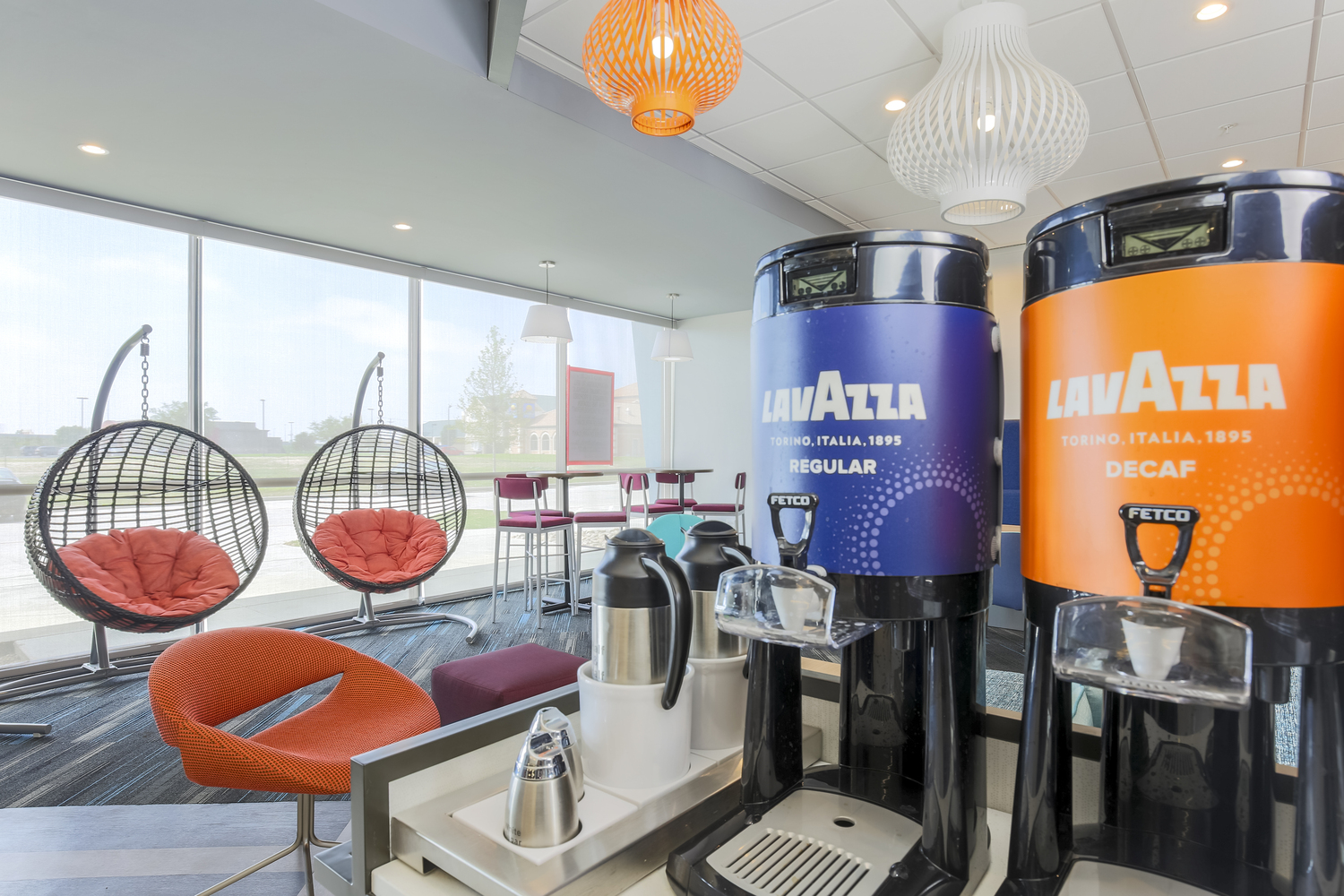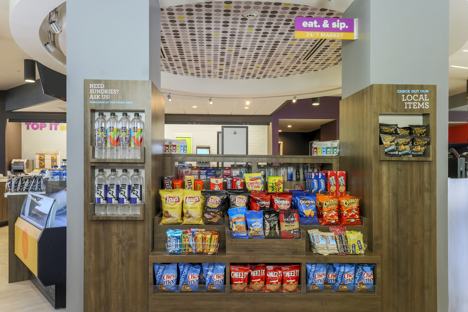 The lobby features a pool table and multiple spaces to relax and enjoy the company of friends, family, or other guests after a long day of travel. The hotel has 90 guest rooms that are just as unique as our lobby. It also features a fitness center, complete with a Peloton, that allows our guests to stick to their fitness routines even when traveling. Every guest can enjoy a free breakfast when they stay at Tru, which helps everyone start the day off on a positive note.