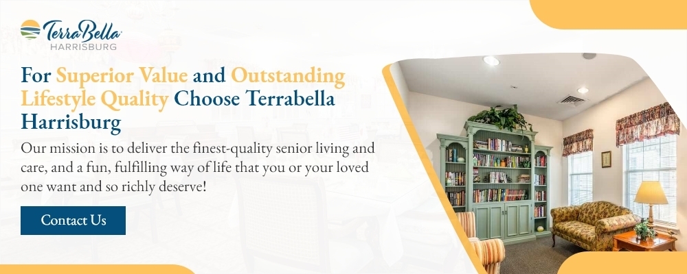 TerraBella Harrisburg is a retirement community that offers personalized services. By combining superior care, amenities and lifestyle programs, we provide assisted living and memory care for our residents. If your loved one wishes to live in a place where there are no obligations of maintaining a home, TerraBella Harrisburg is an excellent option to consider. We offer cozy suites, stylish apartment homes, chef-prepared meals, and organize social events. Contact our senior living professionals to learn more.