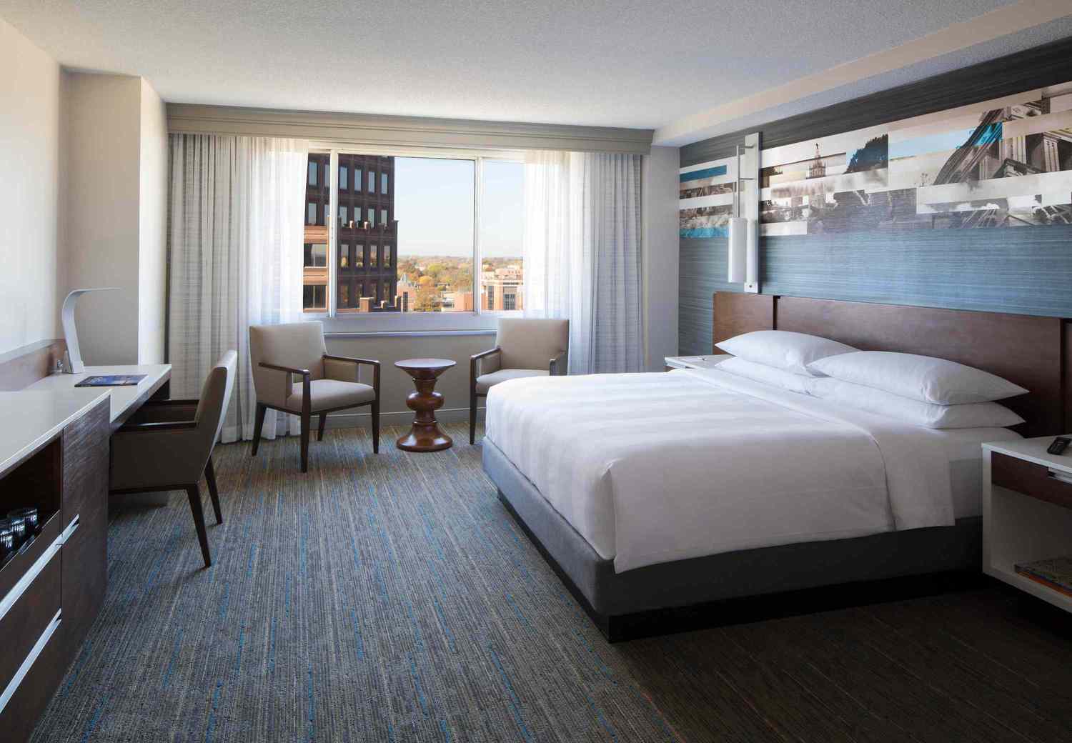 Redesigned with our guests' needs in mind, Kansas City Marriott Country Club Plaza allows travelers to live in luxury while they're away from home. Providing easy access to many popular local attractions such as Uptown Theater, Sprint Center, Westport and the Kansas City Art Institute, our elegant hotel is a great home base for short business trips or long vacations. Located within walking distance to the Country Club Plaza with complimentary door-to-door shuttle service as well. Elevating travel expectations one day at a time, our chic rooms and suites feature large flat-panel TVs, complimentary Wi-Fi and spa-like bathrooms. After getting a good night's rest inspired by our luxury bedding, guests can wake up with a cup of signature Starbucks® coffee from Cafe Express, our on-site coffee house. When guests get hungry, they can enjoy a delectable meal from one of our two restaurants, then burn some calories at our fitness center. Whether visitors are in town for work or play, they'll love the time they spend in the Country Club Plaza area.