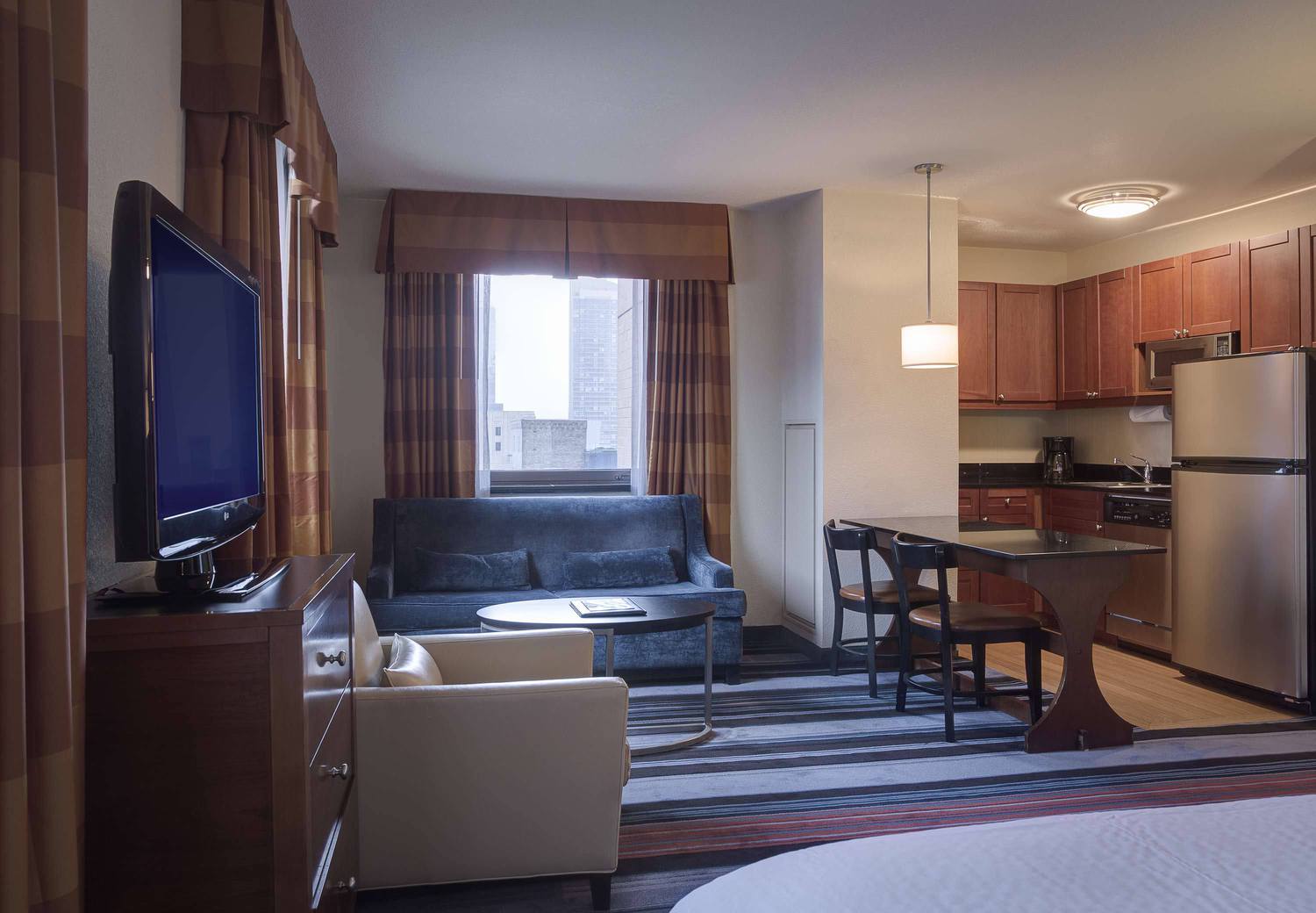 Situated in the heart of the Big Apple and just steps from Bryant Park and Times Square, our hotel makes pursuing business and leisure a breeze. Penn Station is also nearby for convenient commutes. After a long day, visitors can escape the hustle and bustle of the city in contemporary-inspired suites featuring deluxe kitchenettes, spacious work desks, free Wi-Fi and picturesque views. Guests can start their day satisfied with a complimentary hot breakfast buffet, then unwind as you sip custom drinks and dine on creative dishes at Bryant Park Lounge with live music and DJs on specific nights. Anyone can plan their business meeting, wedding reception or social soiree in our Times Square hotel's 6,000-square-foot customizable event space, perfect for bringing to life professional and personal gatherings.