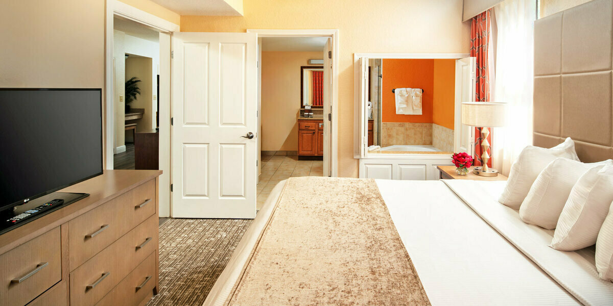 Experience your ideal family vacation at Floridays Resort Orlando! Here, you'll have plenty of room to roam in our spacious two-bedroom suites or three-bedroom suites, perfect for large families. All suites include fully equipped kitchens and in-suite washer/dryers. Play at the large resort pool with zero entry and kids splash pad, relax with quiet time at our second pool, build sandcastles on our sandy beach, and unwind at the poolside bar. Conveniently located near Walt Disney World® Resort and Universal Orlando, Floridays Resort offers a memorable getaway for you and your family. Take our free shuttle to Disney World, scheduled daily for your convenience. Bring your dog to our pet friendly resort in Orlando and settle in with grocery stores within walking distance. With so much to enjoy, it's easy to see why Floridays Resort Orlando is the best family resort for your next vacation.