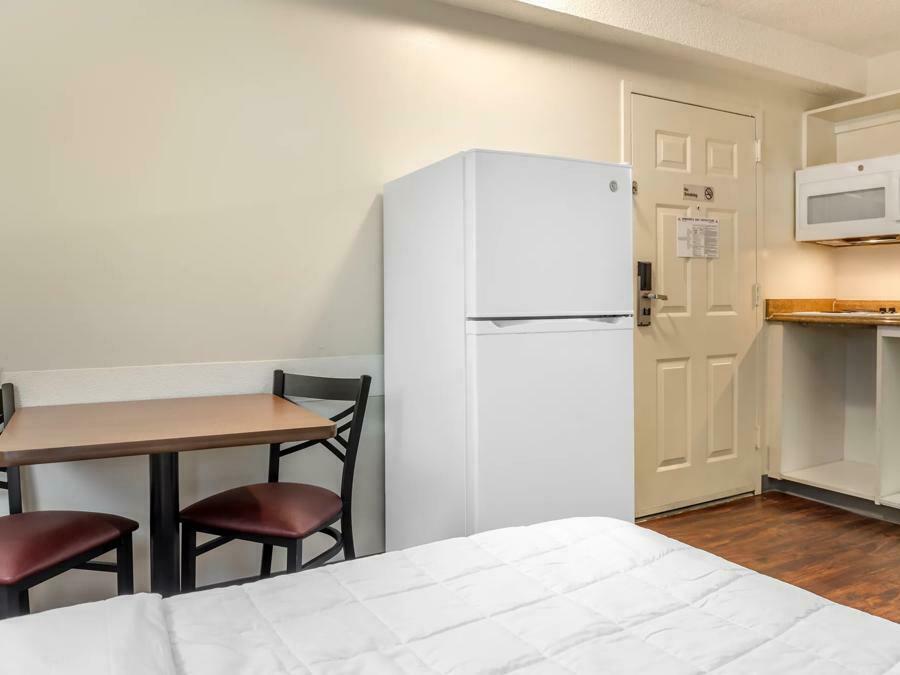 Enjoy a budget-friendly, home-like stay at HomeTowne Studios Louisville. Our spacious studios are designed with guests' comfort in mind, providing all the basic essentials for a short or an extended stay. Inside each studio, you'll find a modern kitchenette featuring a full-sized refrigerator, microwave, stove top, sink, and a dedicated dining area. Should you need extra kitchen items, they're available at the front desk for a small fee.
