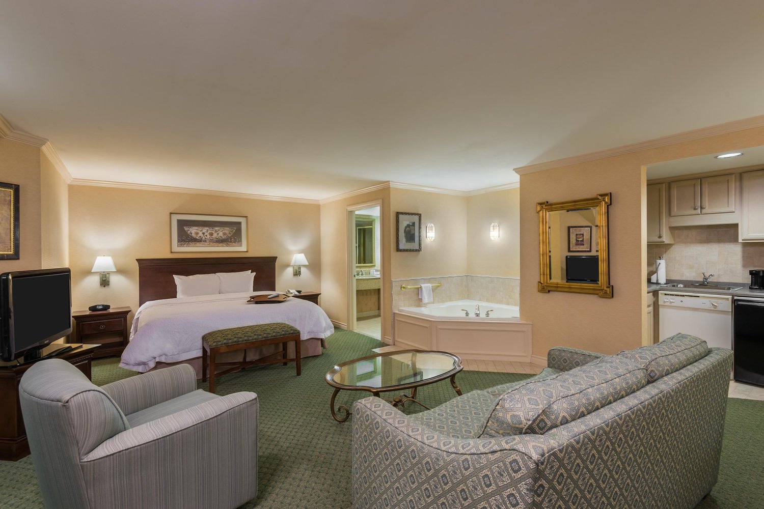 Relax and refresh after work or leisure activities in a comfortable king- or queen-sized bed in one of our 80 guest rooms, measuring 300 - 330 sq. ft. Each room is equipped with free WiFi and a 37-inch flat-screen television. Upgrade to a studio suite for a sofa bed, microwave oven, mini-refrigerator and dishwasher. Some suites feature a whirlpool spa or fireplace.