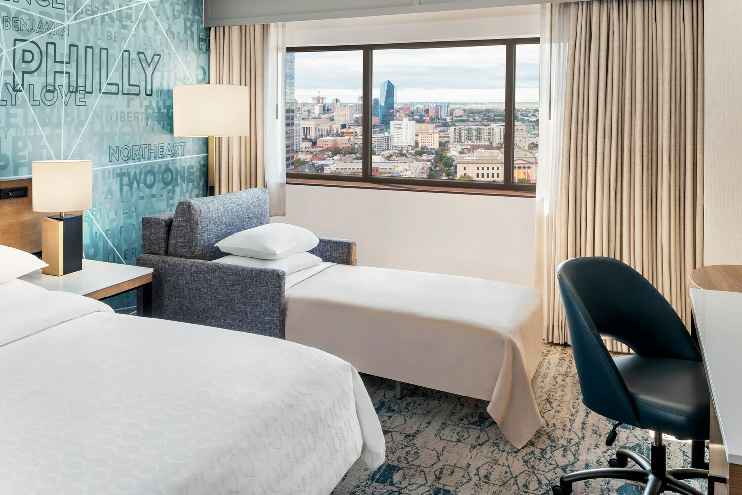 Discover the national treasure of Pennsylvania at Sheraton Philadelphia Downtown. Our hotel in Center City offers coveted amenities to relax and connect in style. Elegant guest rooms and suites feature upscale furnishings, ergonomic workspaces, and breathtaking city views. Delight in American cuisine and signature drinks at two inviting on-site Philadelphia restaurants or explore the city’s vibrant dining scene. Our 24-hour fitness center and convenient access to iconic area attractions, from the Barnes Museum to the Liberty Bell, LOVE Park, and more along Benjamin Franklin Parkway, promises activity and excursion. With 60,000 square feet of versatile event space, our downtown Philadelphia hotel boasts the best features for your next business meeting or special celebration. Just five minutes from the 30th Street Station, access effortless transportation around the city. For business or leisure alike, the Sheraton Philadelphia Downtown opens the door to comfort, convenience and culture with timeless charm.